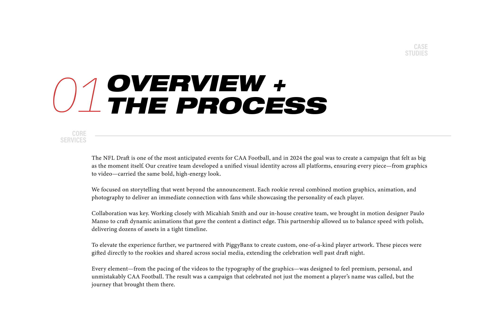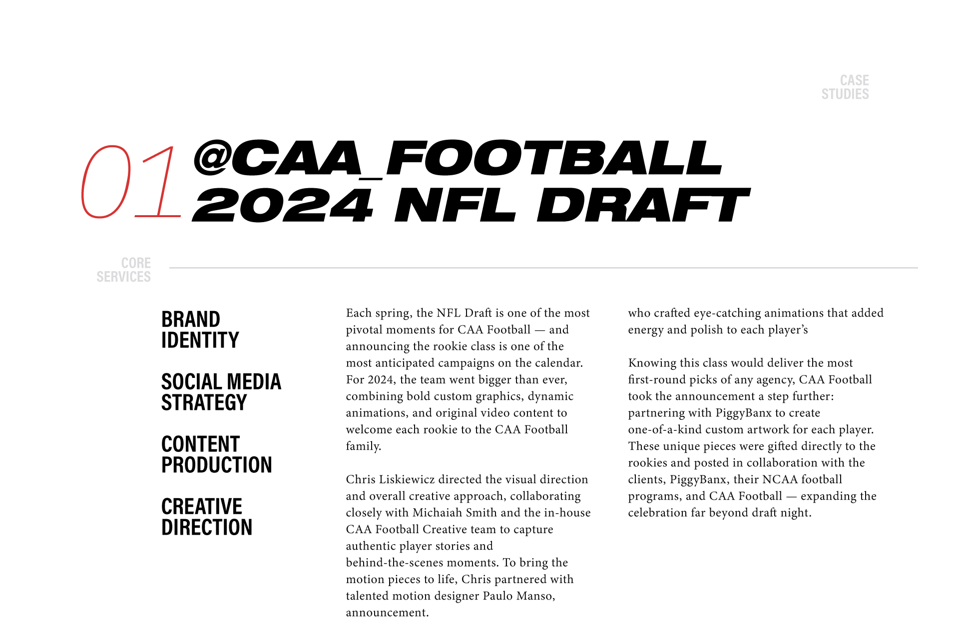 Visual identity, content, and event creative for the 2024 NFL Draft, amplifying CAA Football’s presence on the league’s biggest stage.