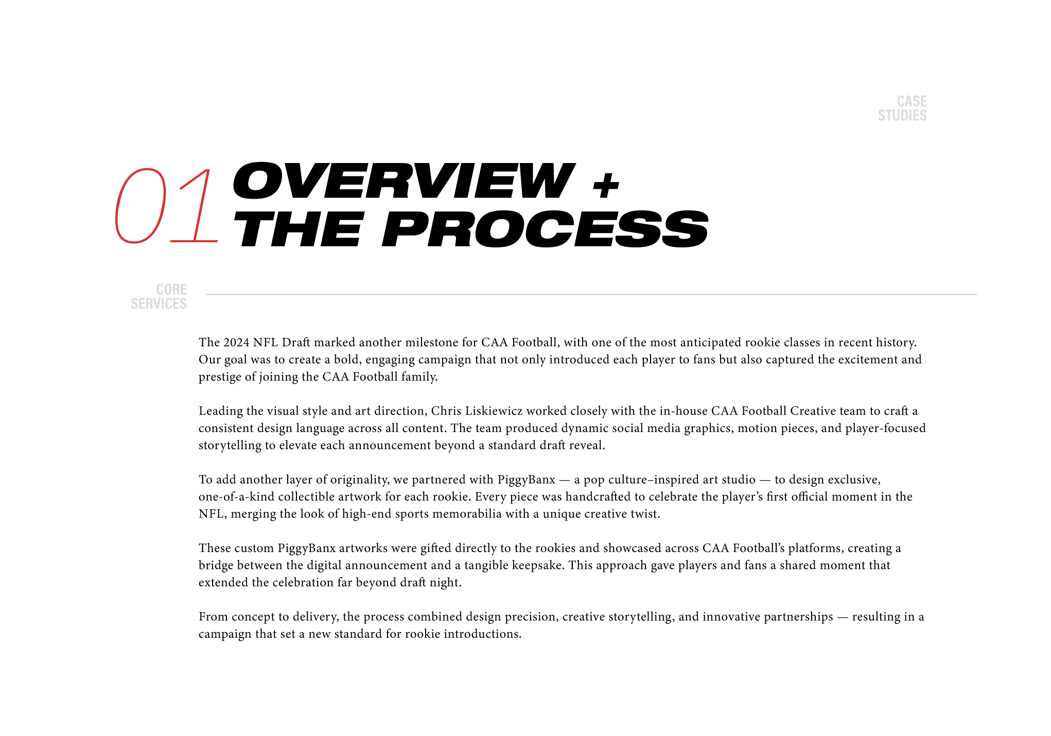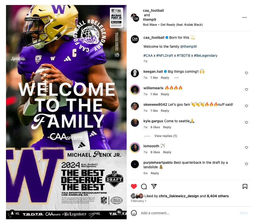 Each year, CAA Football rolls out a high-impact social campaign to welcome its rookie draft class. For 2024, the team leveled up with custom graphics, dynamic motion by Paulo Manso, original videos led by Michaiah Smith, and one-of-a-kind artwork by PiggyBanx — giving every rookie a standout moment to mark the start of their pro career.