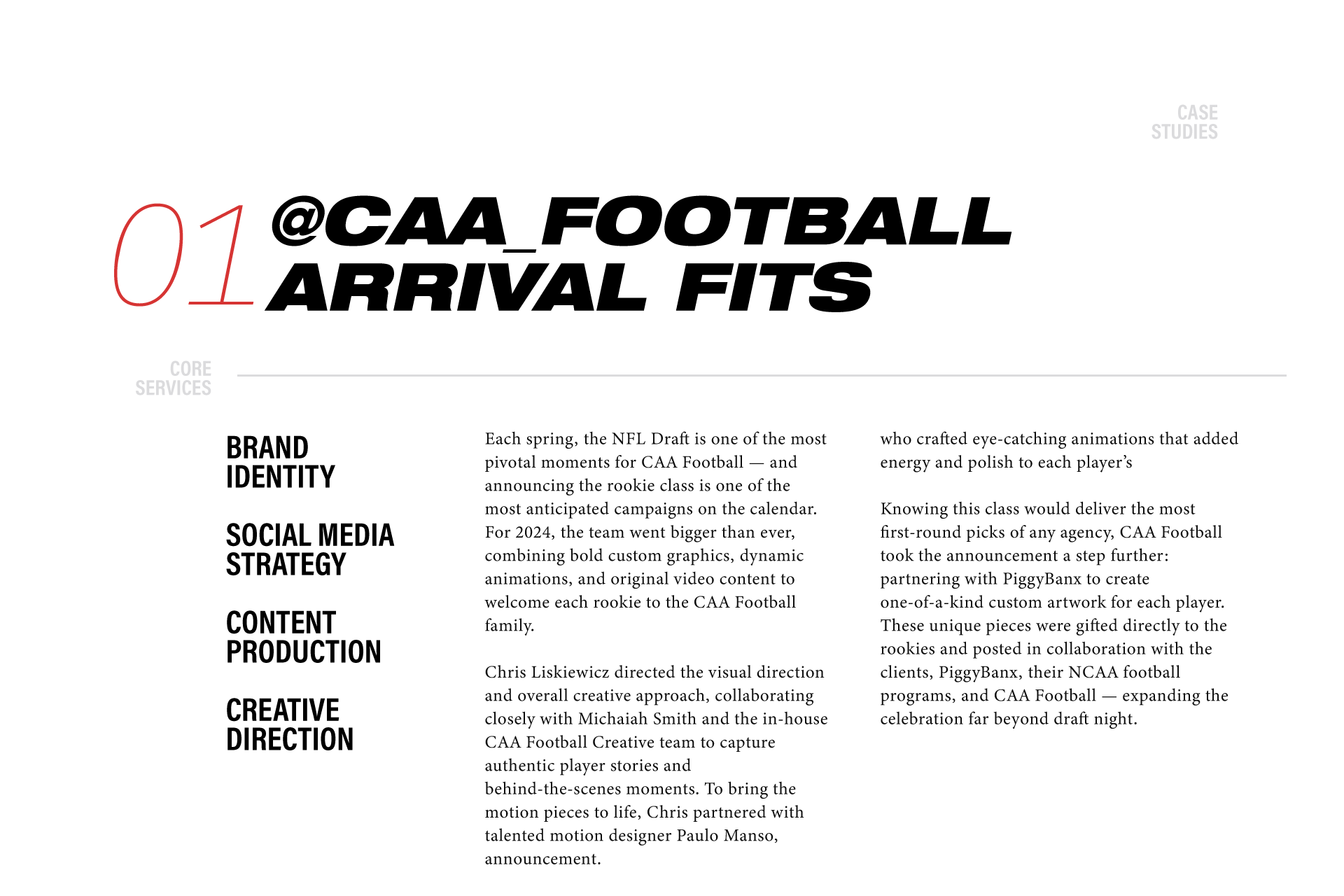 The new CAA Football Atlanta office was designed to feel fresh, inspiring, and unmistakably on-brand. Bold graphics, custom signage, and player-focused moments throughout the space celebrate the agency’s culture and raise the standard for how a football office should look and feel.