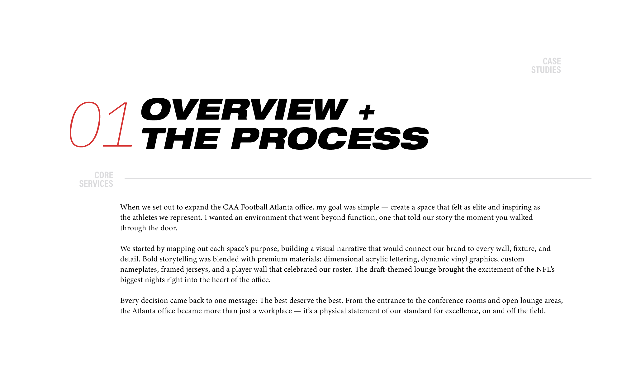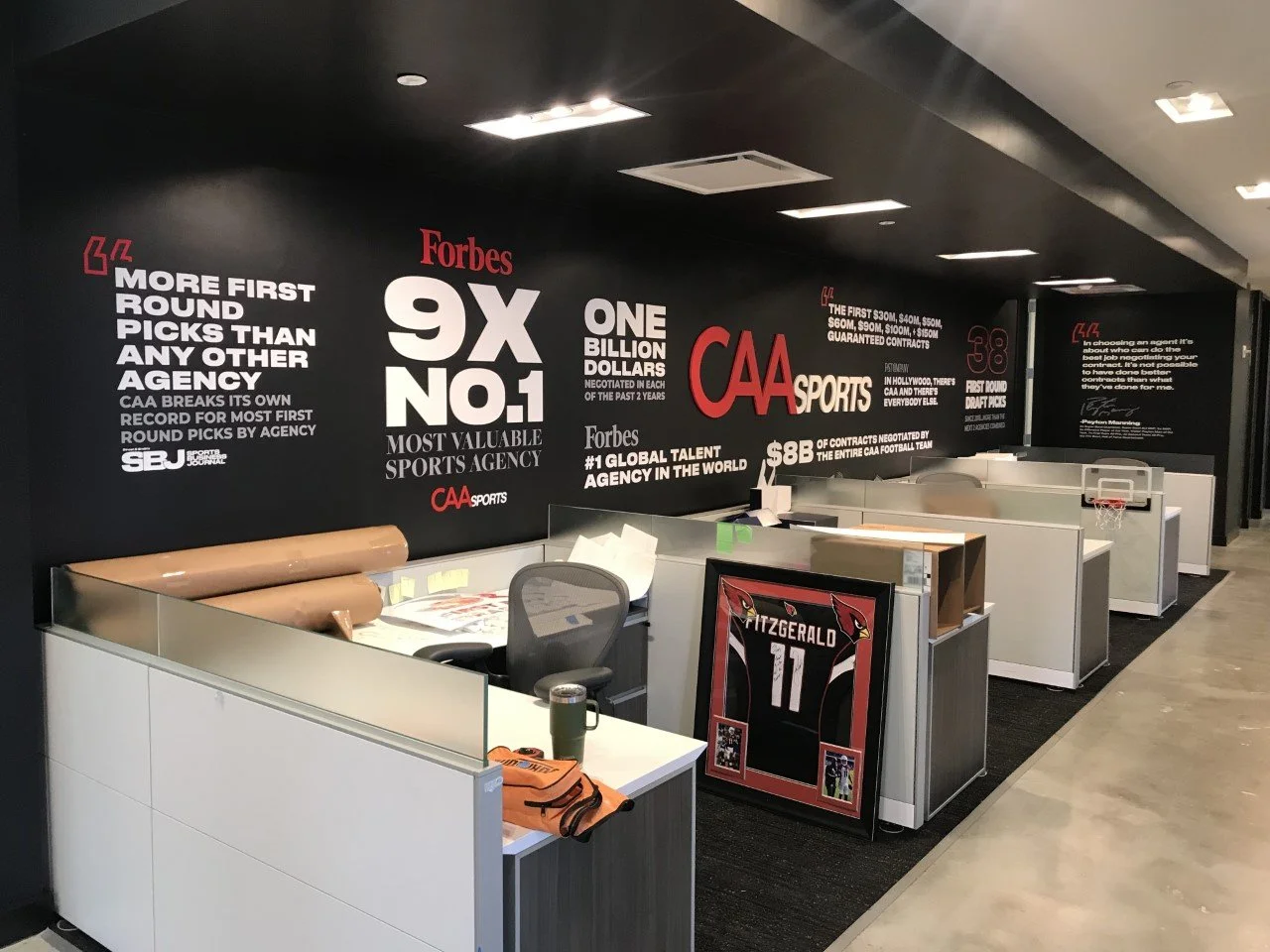 The new CAA Football Atlanta office was designed to feel fresh, inspiring, and unmistakably on-brand. Bold graphics, custom signage, and player-focused moments throughout the space celebrate the agency’s culture and raise the standard for how a football office should look and feel.