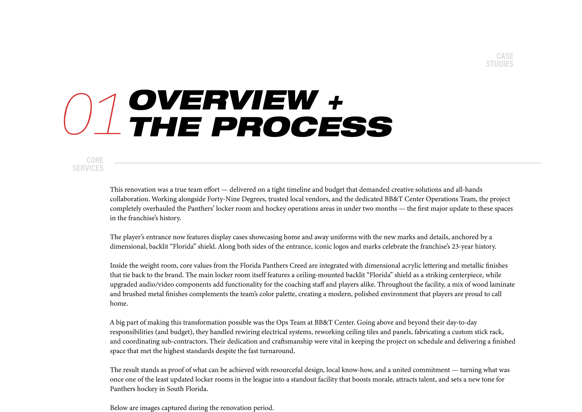 The Panthers’ locker room and hockey operations areas were fully reimagined to match the team’s new identity and raise the standard behind the scenes. By collaborating with Forty-Nine Degrees, local vendors, and the dedicated BB&T Center Ops Team, the space went from outdated to standout in under two months — blending smart design, brand storytelling, and premium finishes to boost morale and help attract top talent to South Florida.