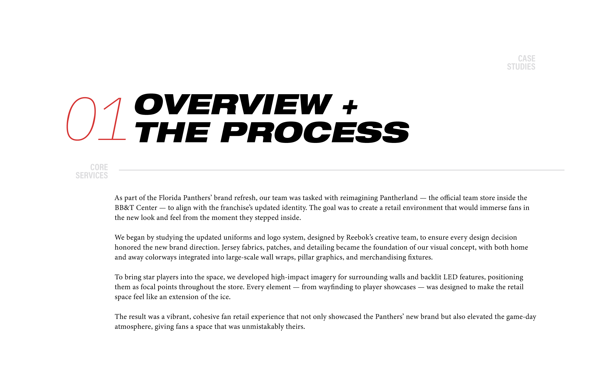 Pantherland, the Florida Panthers’ official team store inside the arena, was redesigned to reflect the team’s updated brand identity and create a more dynamic shopping experience for fans. The refreshed space featured bold new graphics, updated player imagery, and jersey swaps for stars like Aaron Ekblad and Reilly Smith — blending custom assets with shots from a Bauer campaign. Every detail, from wall wraps to signage, was crafted to extend the game day energy beyond the ice and make the store feel like an integral part of the Panthers’ home.